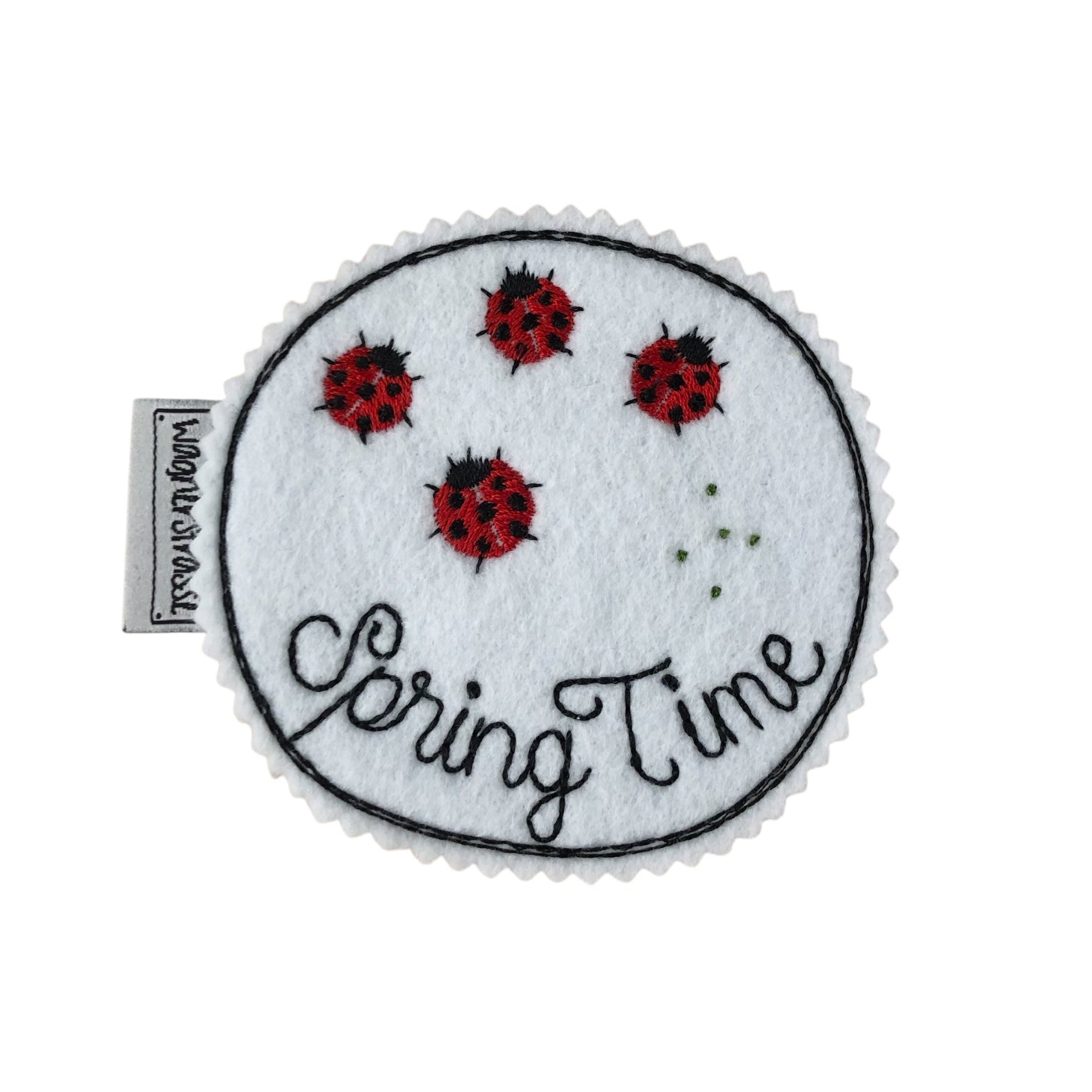 - Sie sind bestickt mit zauberhaften Marienkäfern, grünen kleinen Sprenklern und dem Schriftzug Spring Time.