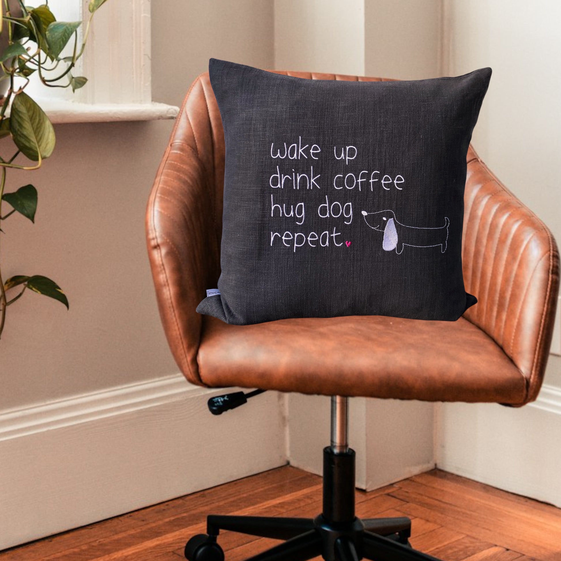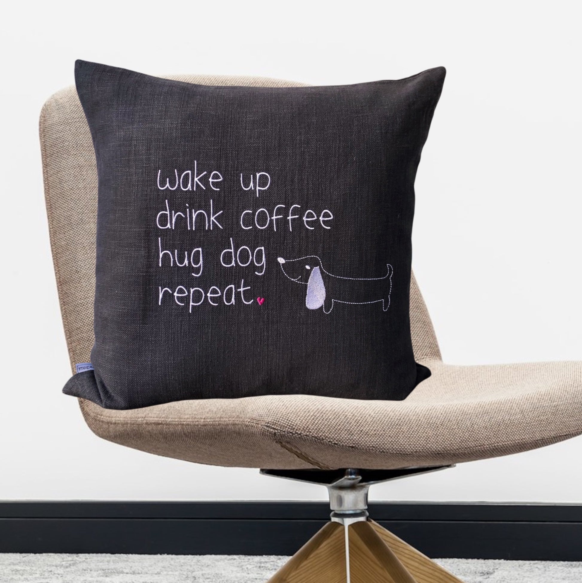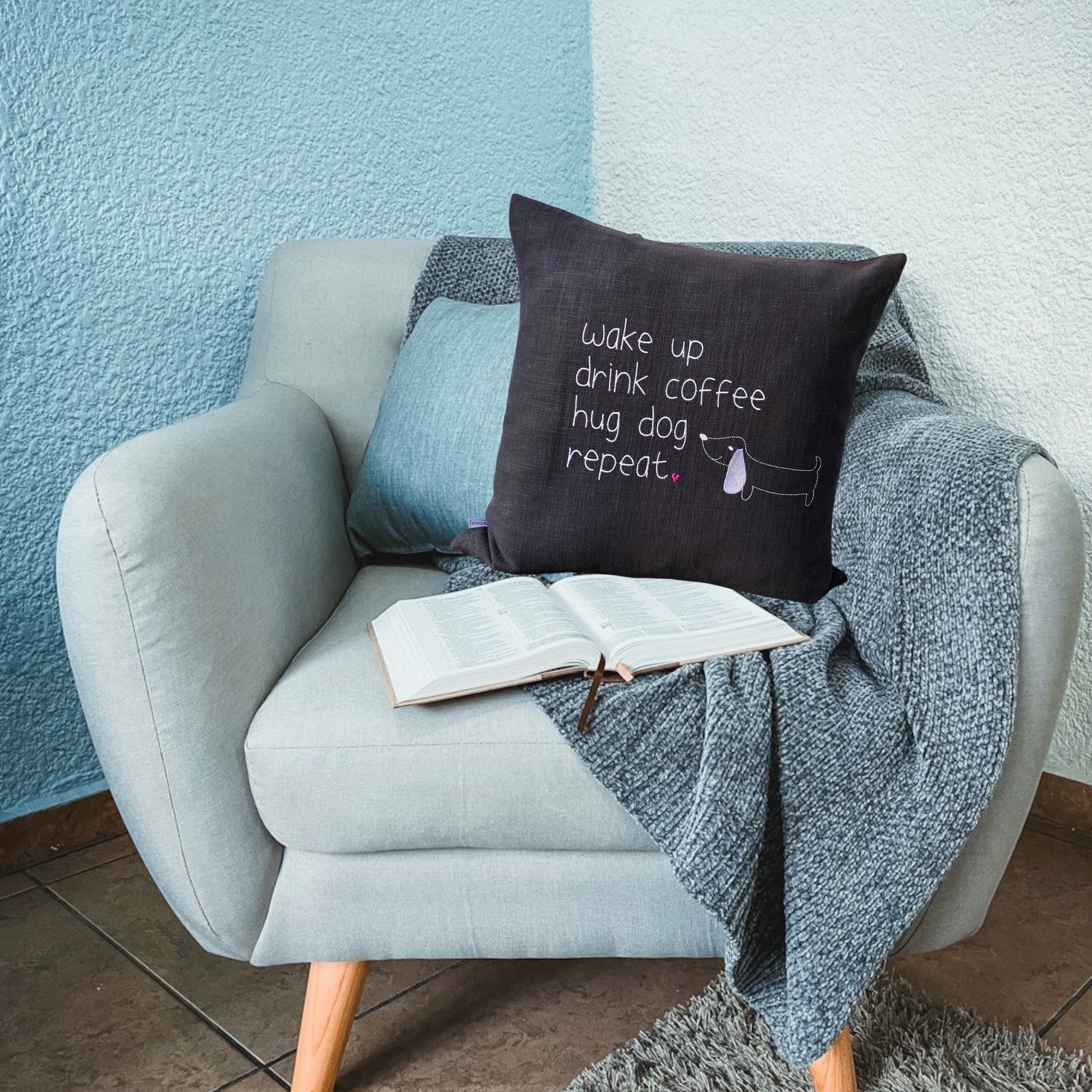 - Das Kissen aus 100% Leinenstoff in dunkelgrau ist auf einer Seite bestickt mit coolem Spruch und einem süßen Dackel*. Die Stickerei ist in weiß gefertigt mit einem kleinen pinken Herzchen als Akzent. Die Rückseite ist unbestickt.